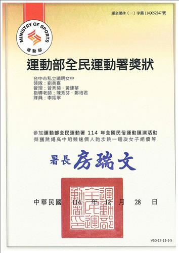 榮獲高中組競速個人:開叉跳一迴旋女子組特優、二迴旋女子組優等、跑步跳一迴旋女子組優等。