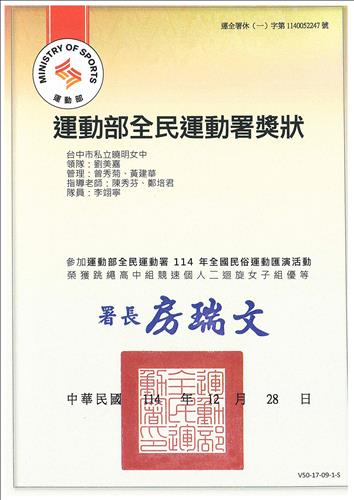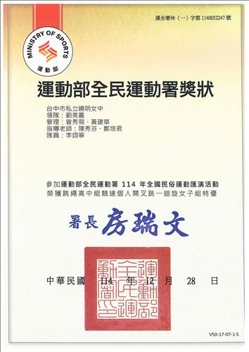 賀!高二丙 李翊寧同學 參與「 114年全國民俗運動匯演活動 」,榮獲佳績!